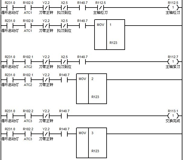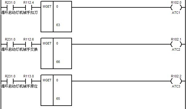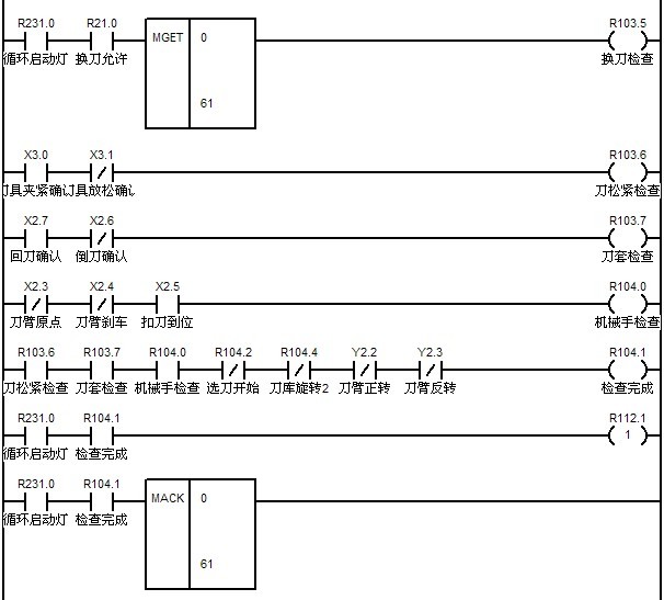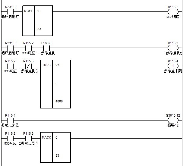 ????? M34的實現與M33類似,通過檢查F寄存器0組第8,9,10,11位可以檢查預設定的機床第二,三,四,五參考點。另外也可以根據需要寫出相似的代碼用來檢查每個運動軸的參考點。